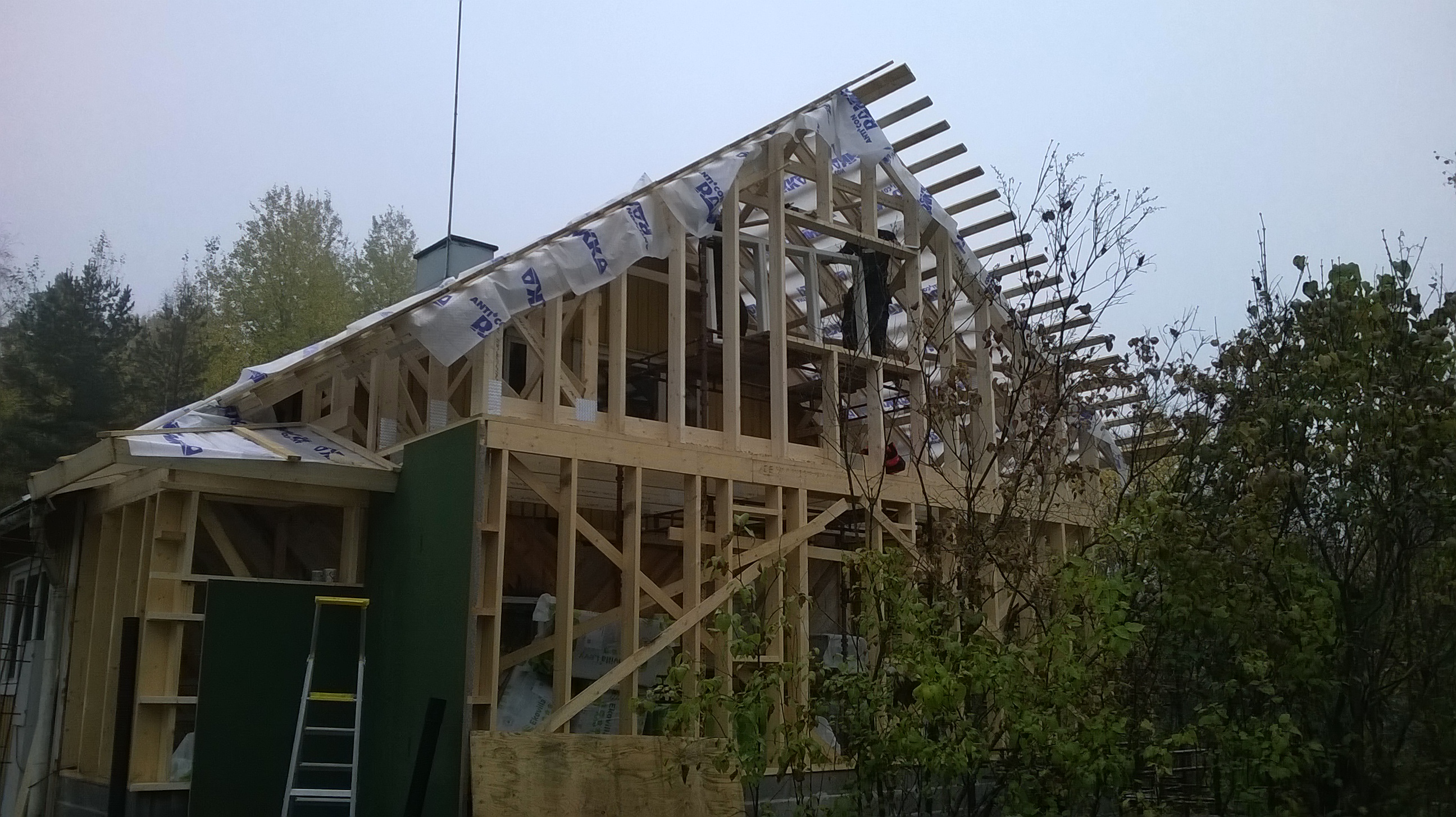 Pete and Lauri are there holding the window, although it’s tough to make out with all the studs and framing in view. The window is a super high-energy model that is now mandatory by EU regulations. Luckily its style is similar to the older windows. The green boards are a wind block nailed to the outer stud walls. Just above the ladder on the left side is another window opening – this one is for the sauna room. The interior is still a stud shell until the inspector signs off. Interestingly, we’re waiting on the inspector. Seems like some things never change…no matter where you are…
