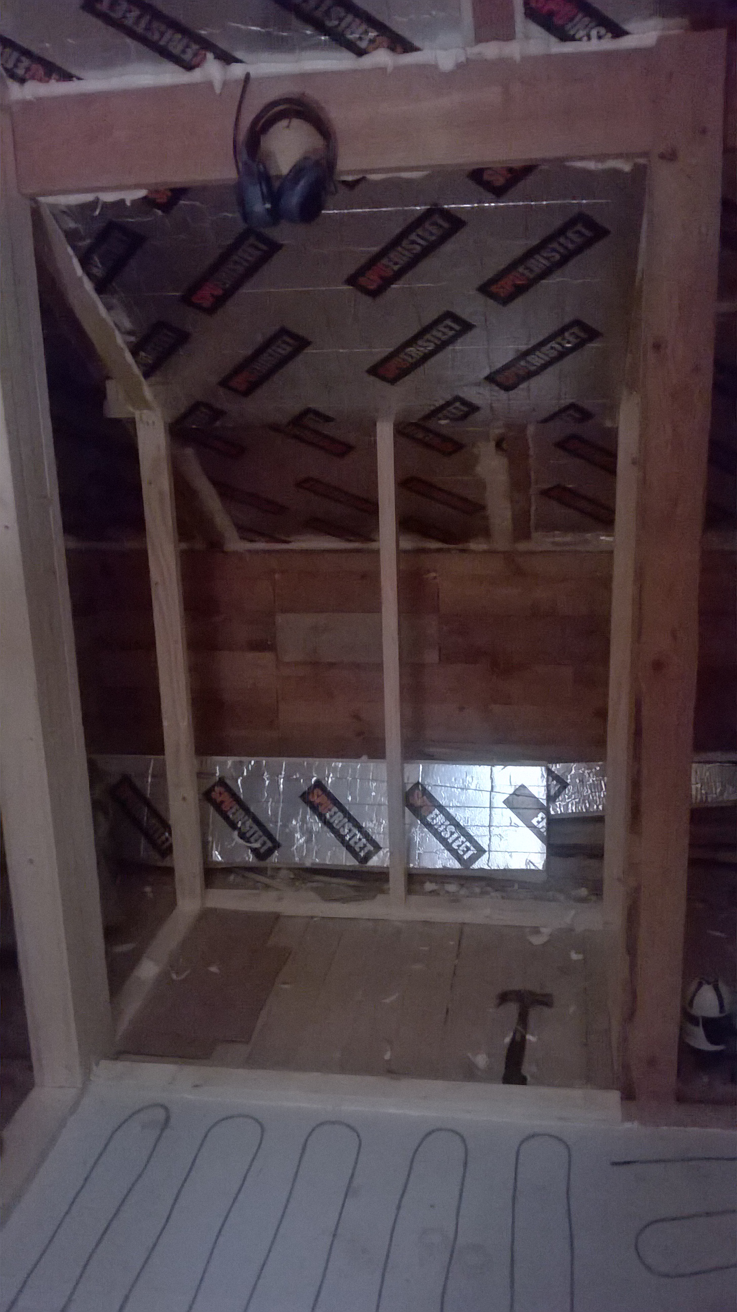 Now that Pete built this little bump out, I realize I could also use the small portion (out of view) just to the right of it for shelves. I think once the soup is set, he might be able to create a shelving area quite easily. I visualize the larger bump out eventually faced with 2 cabinet doors on the upper -preferably with fretwork or other open-type design and a couple drawers below to store larger items and cleaning supplies. The shelving unit could then be mostly for display and extra towels, etc. Overall, the heated portion of the floor is 1,65 x 1,75 meters squared (approx. 31sq.ft.)