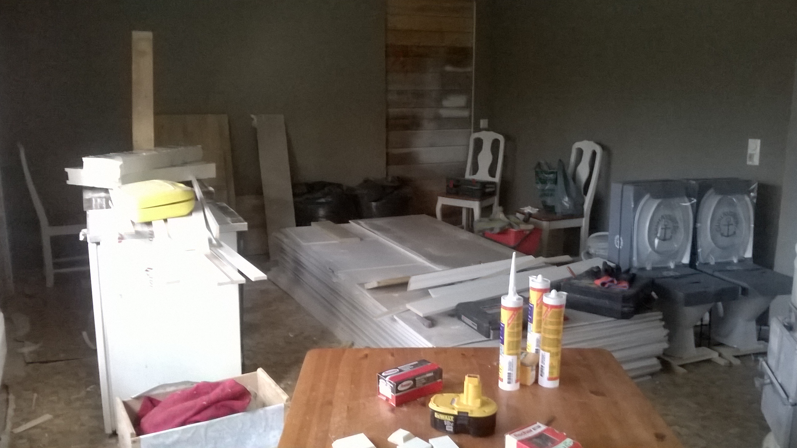 Inside the house, things continue to look more ‘construction zone’ than ‘living space.’ The living room shown here is filled with miscellaneous furniture, drywall, and a pair of toilets awaiting installation.