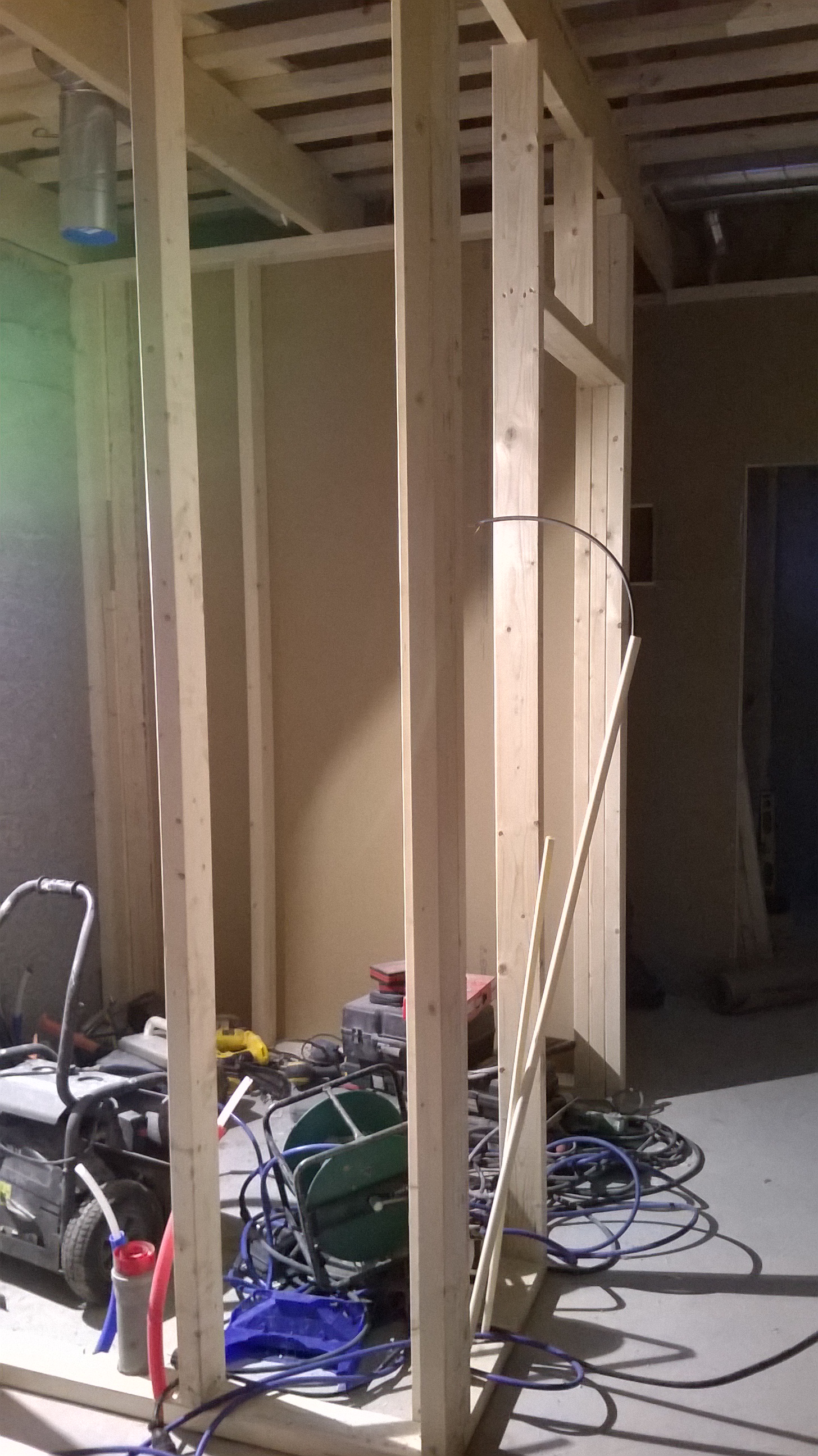 When the second-go-round of cabinet and sink installation was completed, Pete devoted his time to getting a jump on the shower area downstairs. There was a lot to do there, including establishing where exactly to put the bathroom walls. The architect plans had once again come up wanting, so those plans were tweaked somewhat here and there to get a more favorable result. The sauna area has been reduced in size and is now confined to the ‘bumped out’ front space of the new construction. There’d been an idea to extend the sauna into the ‘bathroom-shower’ space, but that idea was abandoned once I convinced Pekka we really didn’t require such a large sauna for just 2 people. And, the extra space in the shower and bathroom would be enjoyed everyday.