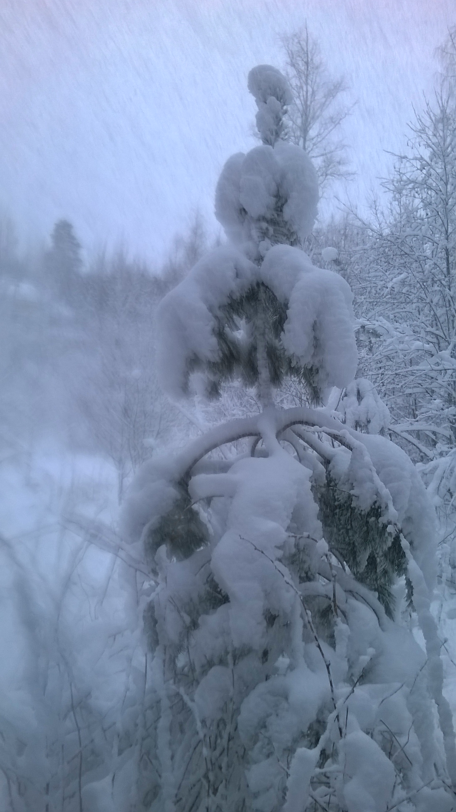 snowing and blowing. Tykkylumi. A condition of too much snow and cold on small tree branches… it causes this