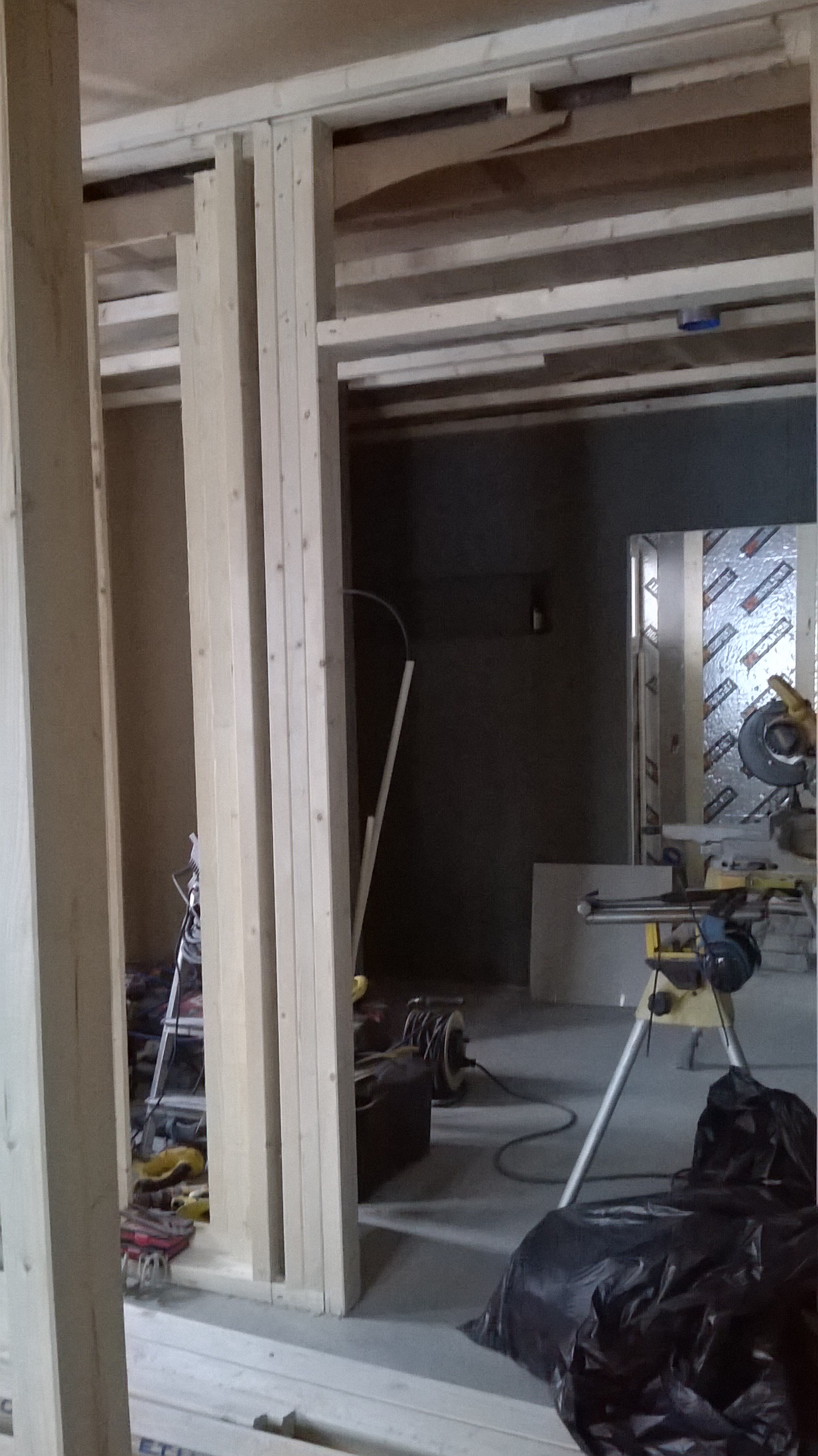 About the time Pete got this all up, (see above) I realized it wasn’t the best use of space and talked everyone into modifying the layout. We took out the ‘door’ framing and pushed back the wall that divides the bathroom from the shower approximately 18 inches. It left us with a bathroom that feels larger and a shower that isn’t tunnel-ish. 🙂