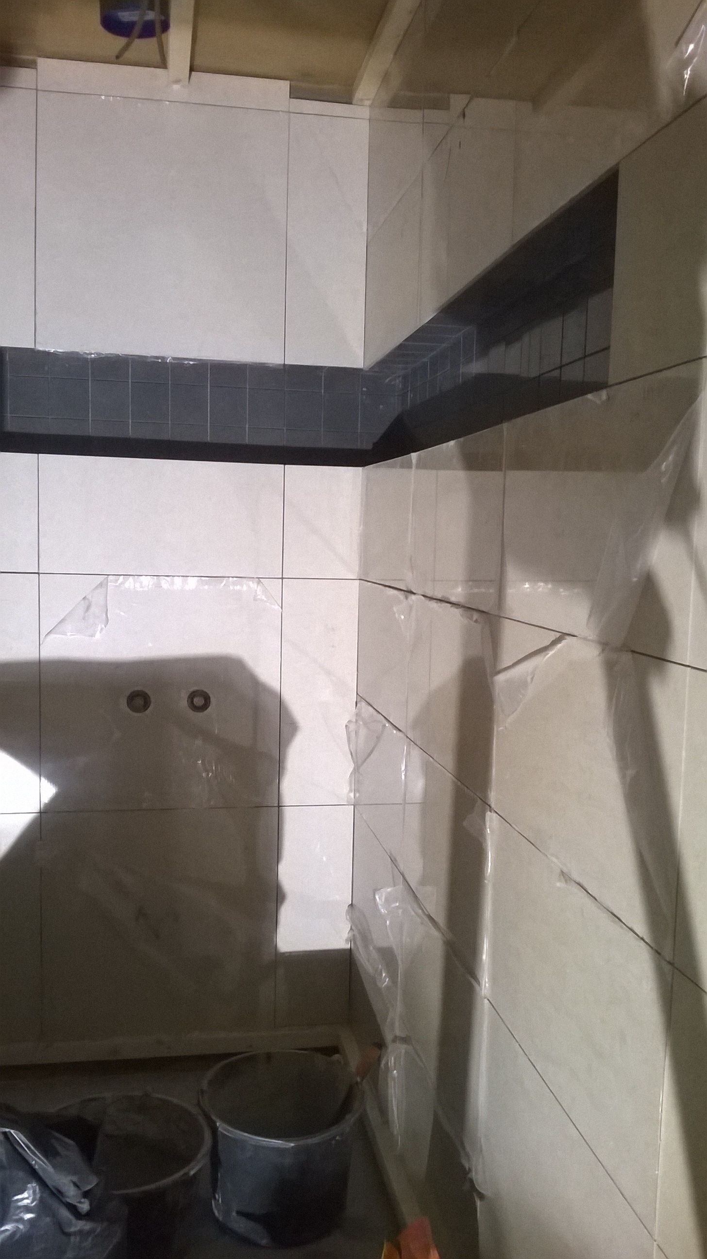 Pete got the wall tiles up in the shower. Next to do are the bathroom walls, then next to do is grouting it all. None of the flooring has been installed yet. But it’s almost time for our beautiful 60cm x 60cm floor tile to go on! Once the floor is in, the hot-water boiler will be moved into place. It’s taking up time in the porch right now, heating up nothing 😦