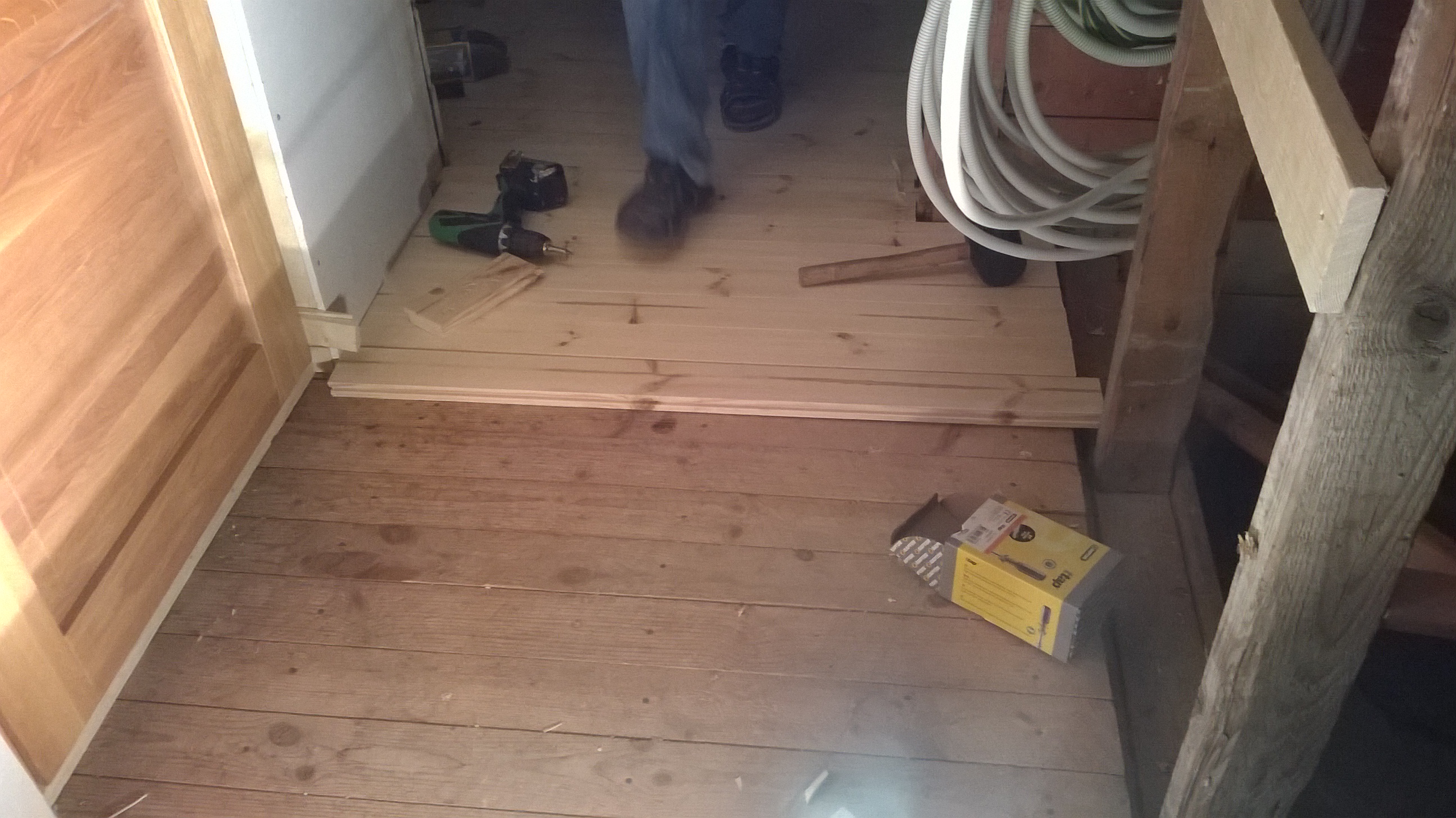We decided to use solid wood flooring throughout the old and new space up here. It will require sanding, staining and sealing, but the finished result will be more satisfying than the available laminate options.