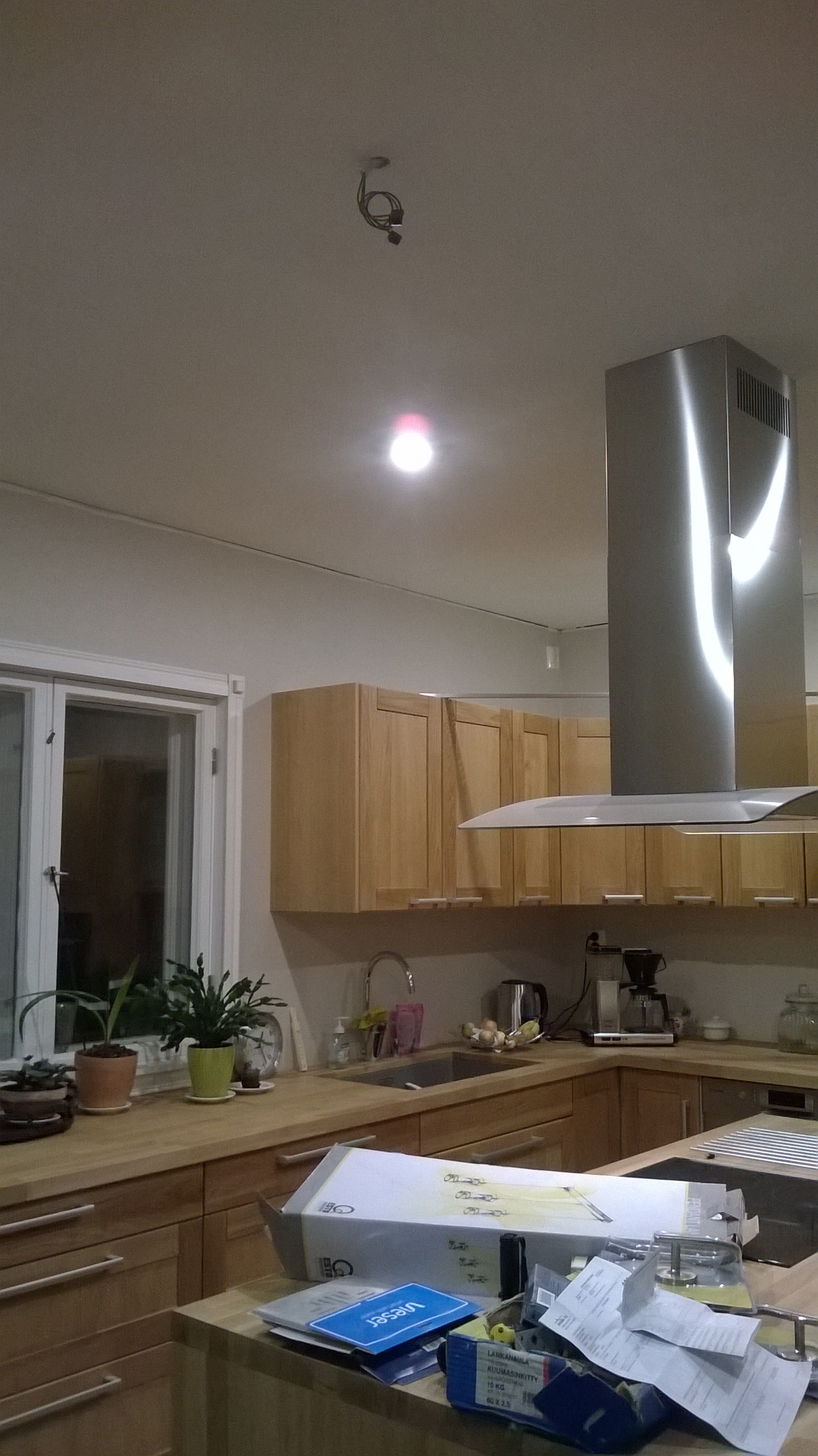 There just doesn’t seem to be enough space remaining to pull off mounting this striking light fixture so close to the ventilation stack. I’m wondering what you think? The next best place is above the kitchen windows, centering the light between them. We’re not lacking for light in the kitchen – the LED lights were using seem quite adequate to me. But I have two of these 3-pendant lights, the other one still looks like it will work in the dining room although the electrician has informed me, “hard-wired” electrics are against Finnish Law! Oh good grief, what next! So the ceiling in the dining room looks just like this one except he cut a 20cm round hole for a 4cm long rail. Yippee!!