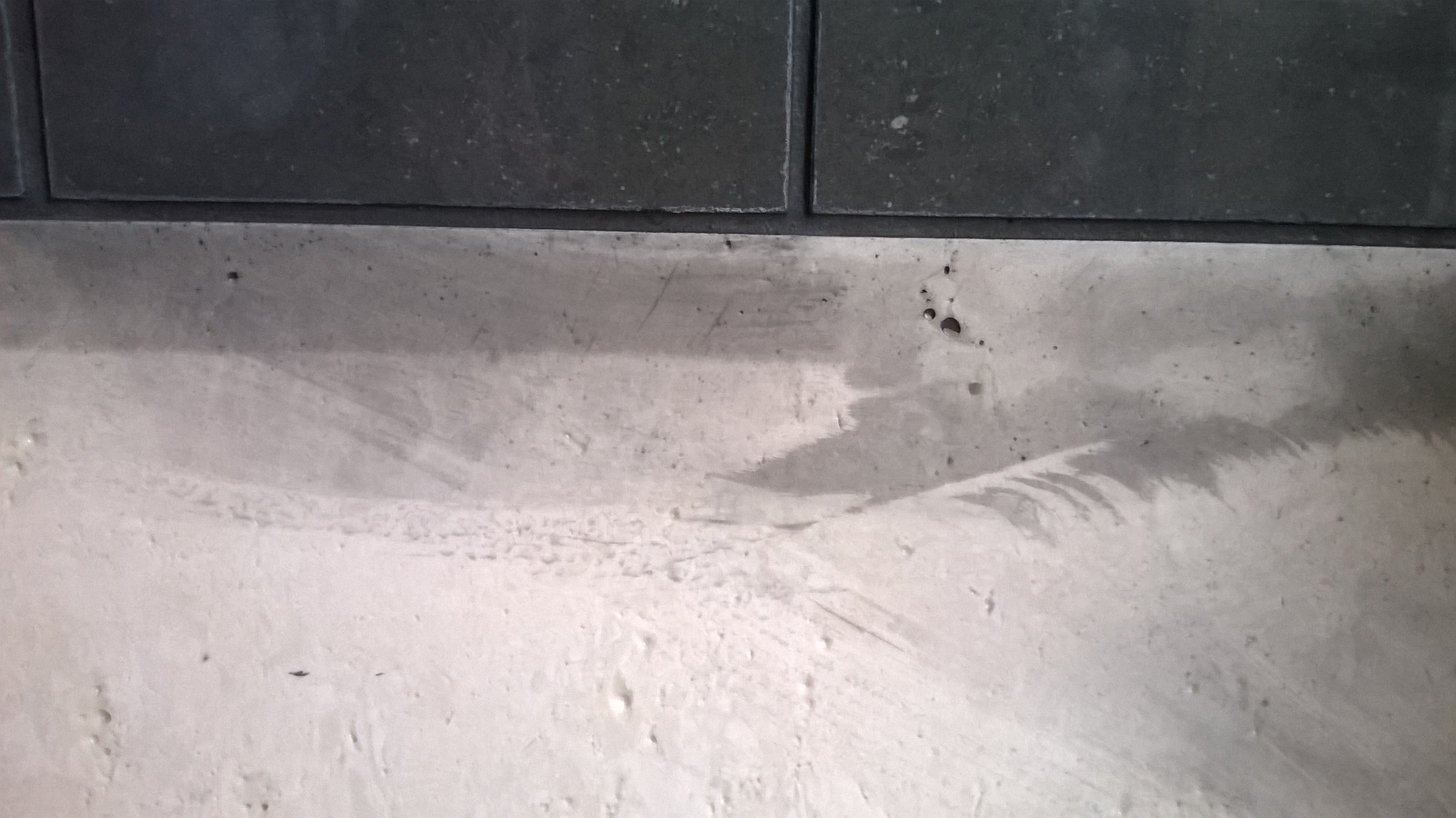 It’s supposed to rain next week. If it does I’ll be back inside to clean this room up and get those touched up areas re-painted. Afterwards, I can put another coat of stain on the floor. Pekka got the closets outfitted with rods and they are ready for clothes. Now if only we had enough time to actually sort out the clothes we could get things out of boxes… 🙂 Things didn’t work out too well while setting the tiles for the downstairs bathroom vanity. Apparently Pete got confused and decided to use the remaining floor tiles (which cannot be repurchased-out of stock/discontinued) for the backsplash instead of the wall tiles we had. The resulting SNAFU exhausted the floor tile supply so we have none left should we ever need to replace one. The other issue was the tile he used is honed and when he grouted the darker marble tile the overwipe caused this to happen…