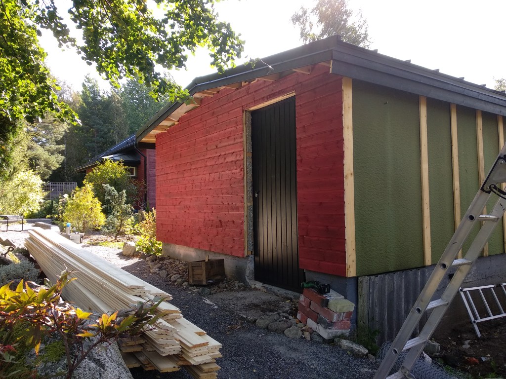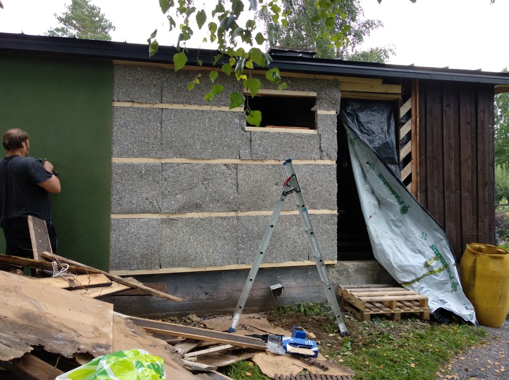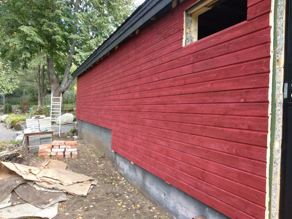 Realizing we could take advantage of the good weather as a time to get the siding on, things sped up rather quickly. If it was the weekend, we were working the whole day until after dinner time. If it was a weekday, we started once Pekka was done with work. One entrance door had been installed already by this time, but the other shown above still needed to be installed and painted. So we did that. Once we got the whole building prepared for siding, we got busy installing siding. Really, in only a few hours one end was already done.