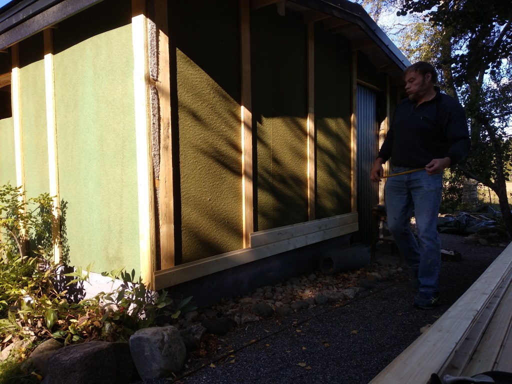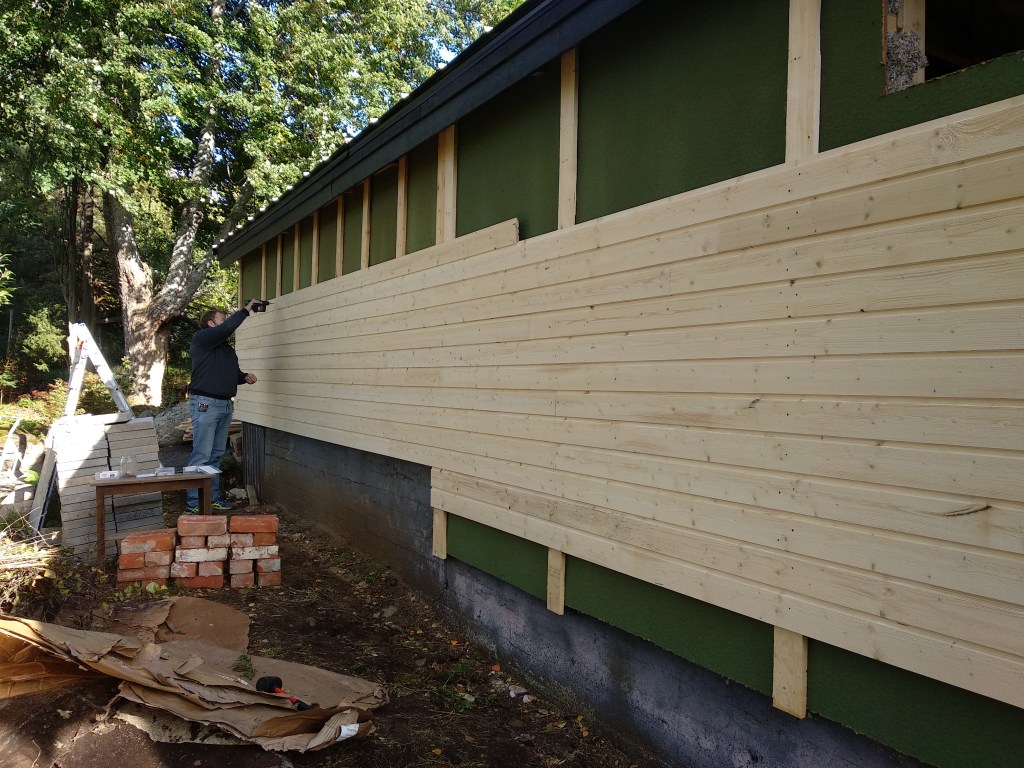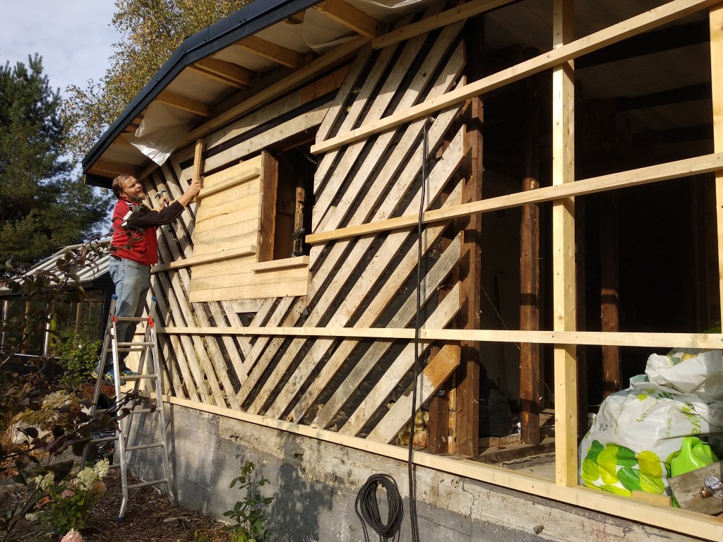 Another benefit of having a good weather forecast was deciding it was the best time to buy and install the siding for the shed building. Figuring we had about two weeks to work with, Pekka went *ALL IN*. We kicked things into high gear and finished the remaining removal and install of new replacement insulation & breeze board to prepare for the siding.