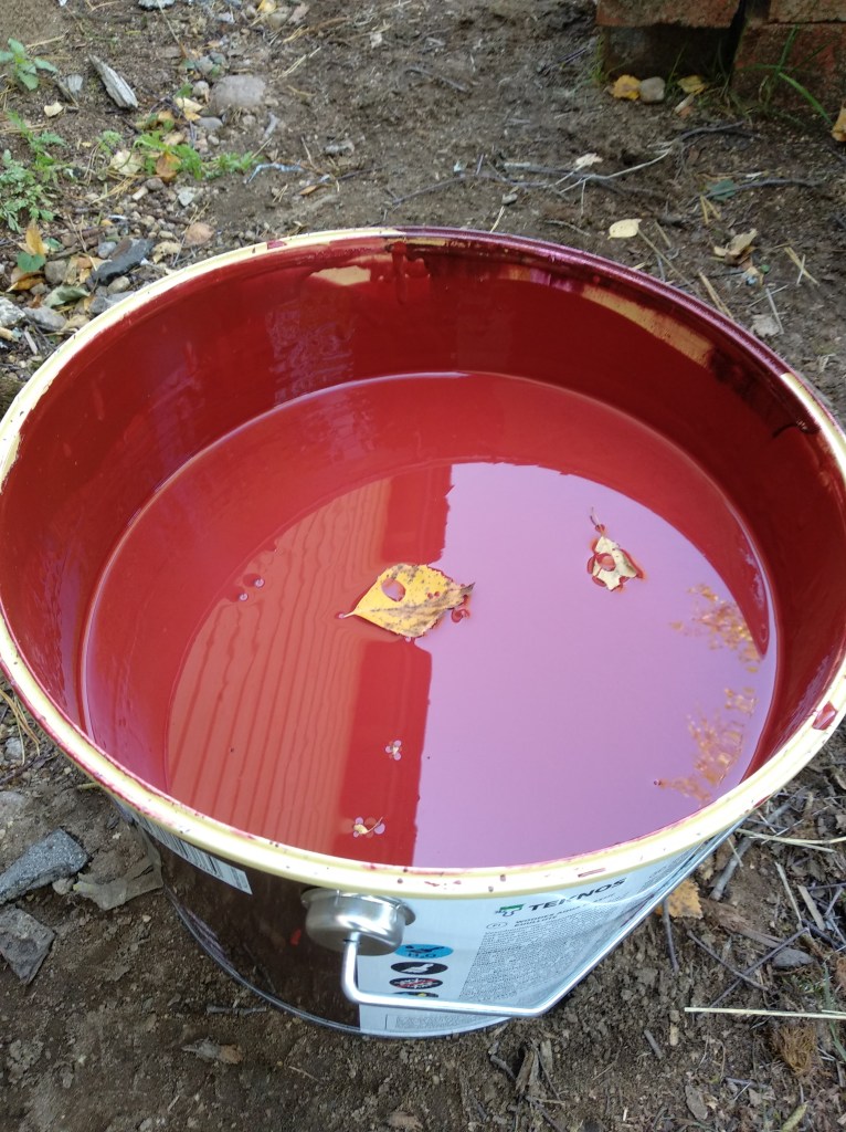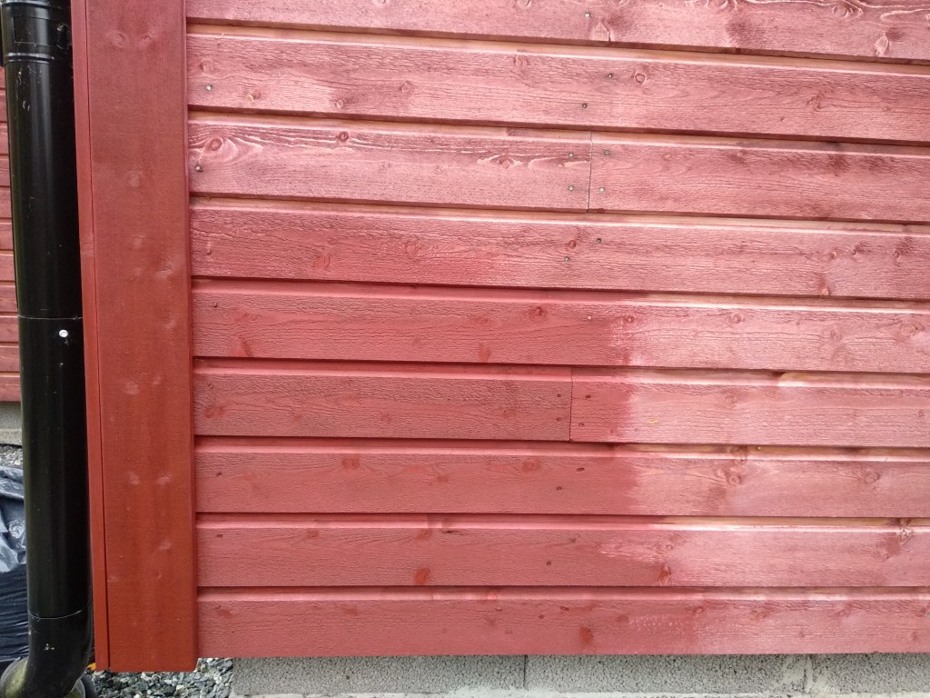 With computerized paint/stain tinting I’m not so sure how much I need to worry about making sure the color from one can, matches the next bucket. BUT to be on the safe side I am using an *old school* trick of reserving a portion of the first can to mix with the new can to hopefully find a blend which is as close to an exact match as possible. FYI paint/stain is sold here by the litre. And in our case for large jobs it’s arriving in a 9l metal can – which would be about 2.5 gallons. Somehow despite my best efforts, I doubt I’m getting enough stain on the boards. Once that final bucket can be located and the end portion covered, I do plan to add a second coat to the entire west facing side. This is the side that we can see from inside the house and the side which will bear the brunt from the sun and rain. Hopefully, that final bucket materializes soon while the weather stays good for painting!