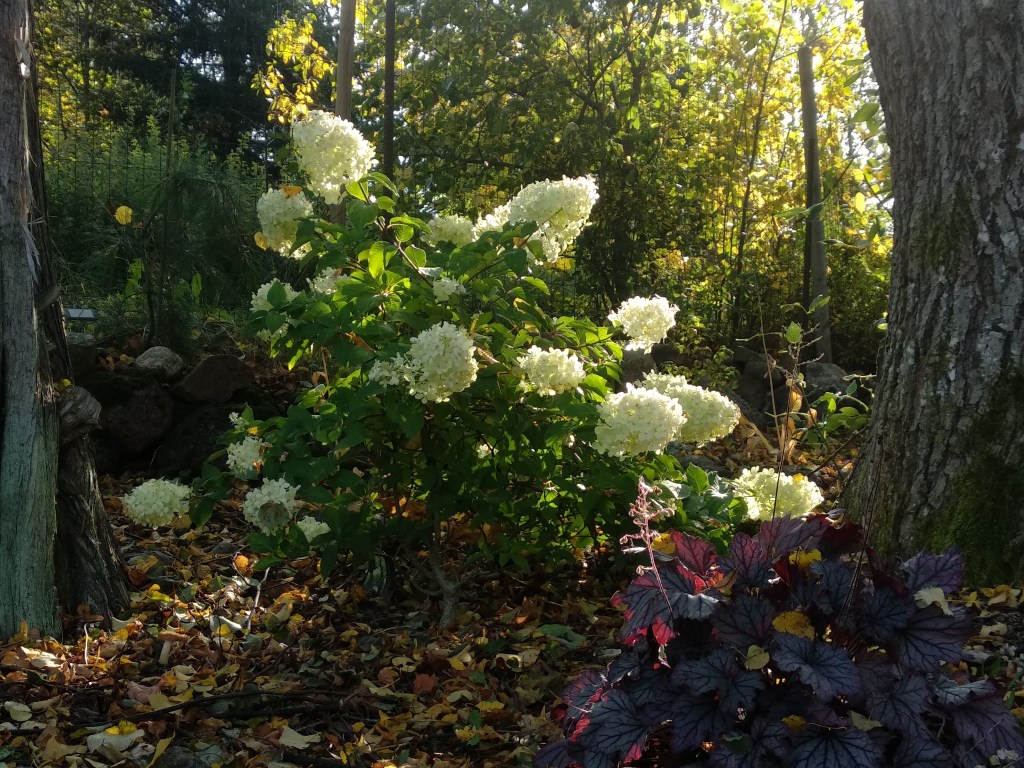Things are looking pretty good in the garden despite the lack of rain, (except those Mustila hydrangeas & the Pinky Winky) The blue skies have been welcome and the daytime temps were close to 20c most of last week. The colors of leaves on plants as well as trees has undertaken a dramatic change over the last couple of weeks. They seem to know, despite a few unusually warm tantalizing days that *winter is coming* and just around the corner. Already the ground is beginning to look more like, a ‘job to do’ rather than a green space to enjoy. Getting the rakes out is one of my least favorite garden chores. There are just way too many leaves, and most, if not all aren’t even from trees on our side of the fence! At least with the warm weather, I was able to keep the grass in good nick. Very tidy and the edges got re-done recently too, which adds so much to the overall aesthetic. I like a well-kept yard!