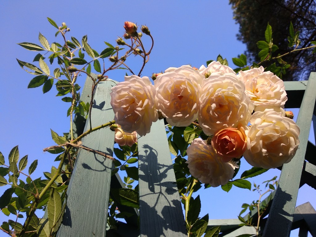 Enjoy the following highlights – they are fleeting! First a lovely Limelight hydrangea and heuchera in the back roadside garden. Below Ghislaine de Feligonde climbing rose
