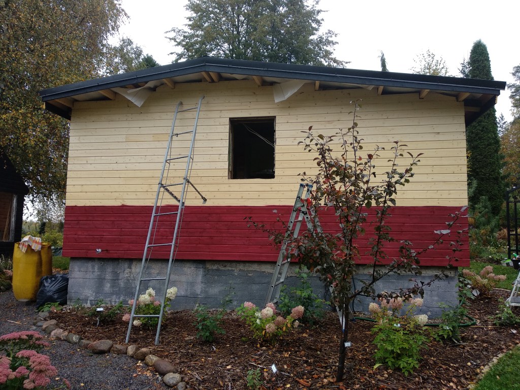 And so this process was repeated all the way around the building. Pekka and I put up the siding, and eventually I traded the hammer or drill for a paint brush.
