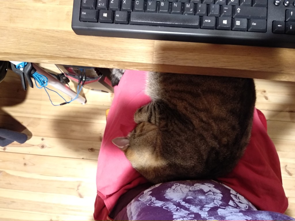 Every day it’s the same. Early wake-up, and then hours of napping on my lap, or for as long as I will sit in the chair. Sometimes she will follow me into the tv room where, after getting re-adjusted, she continues her nap. Our routines are pretty well entrenched it seems. The day-to-day existence is pretty predictable.