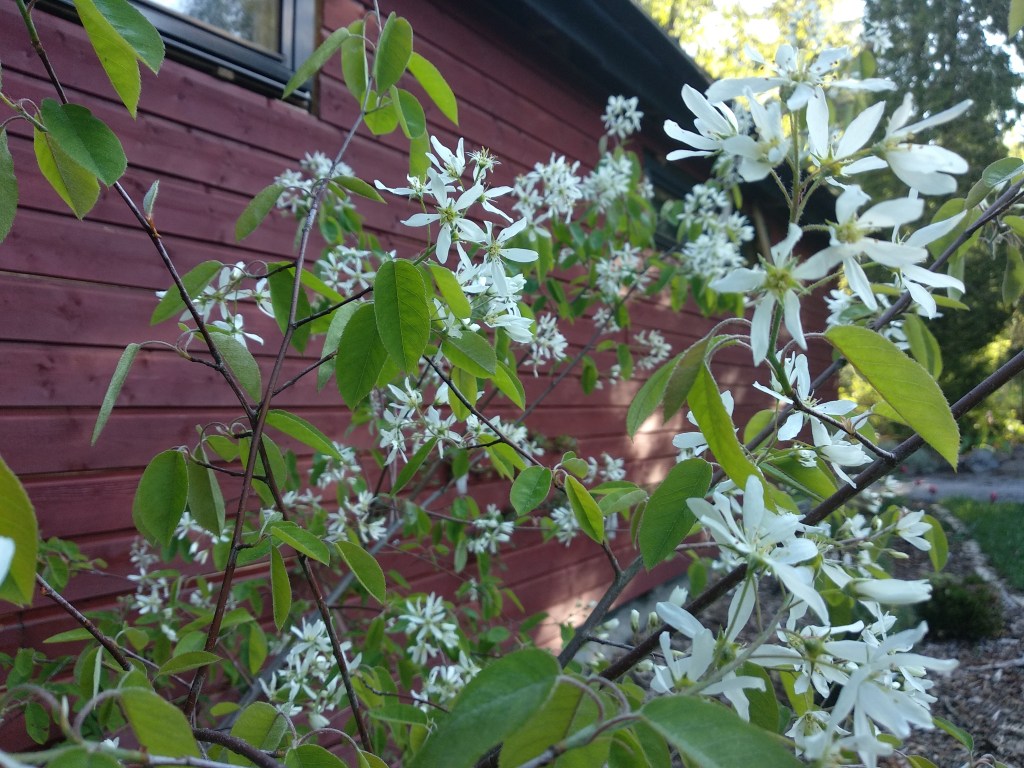 Something we added quite late to the garden was this Juneberry – Amelanchier lamarckii – which can be either a shrub or a tree (how nice!) Ours is listed among the flowering bushes & shrubs within our, What’s Growing at Vanha Talo Suomi, garden page. Possibly it will surprise us and decide to be a tree someday – hopefully it will find the joy to be either form, from where we have situated it prominently in front of our shed/out building. The flowers are small, yet delightful, and seem to dance upon the branches in even the slightest of breezes.
