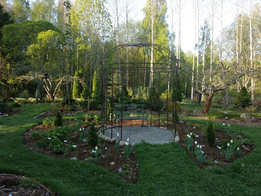 Well, now that it’s in position, I think the pergola looks like it should have been there the whole time. Funny how some things are just so naturally well-fitted, you wonder how you could have managed without them beforehand. Am I speaking about the gem garden, the pergola, or could I possibly be referring to my assistant head gardener in this whole production: Pekka?! hmm. (I got so frustrated/mad while putting that thing together, thanks for not killing me Chief!) Now, this gem garden only appeared in place last April – so a year and one month later – the gems are emerging from the ground for the first time in their new situation. Not only have they survived through Finnish winter, they are just that teensy bit bigger! I hope they put on another summer spectacle as they did last year! For everyone who is just now tuning in, the gem garden is filled with an assortment of perennials including: peony, daylily, iris, phlox, delphinium, and a whole host of other summer-blooming perennials. All of it accentuated by five DeGroot’s Spire conifers. We had the metal seating/bench already, but in another location. Pekka said, “hold on!” And promptly loped off, returning with the bench and snuggled it into the back of the pergola. Perfect fit! I’m looking forward to the years ahead when sitting on the bench, under the perfola, surrounded by blooms and snatches of colorful gems will be an immersion of tranquility and beauty. Right now, I’m mostly marveling at the potential. I’m happy with the small pleasures the flowers and plants have to offer us in their infancy. Watch this space! It’s the mantra of this garden, or so it seems 🙂