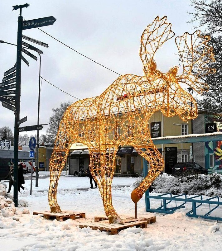 Most towns of size throughout Finland decorate lampposts with electrified light holiday decor of some kind. The neighboring town of Nummela, has a very lovely lighted moose in the town center, which is brought out of storage to sit in the market square for Christmas. This photo from 2023 shows it in daylight hours. It’s massive!